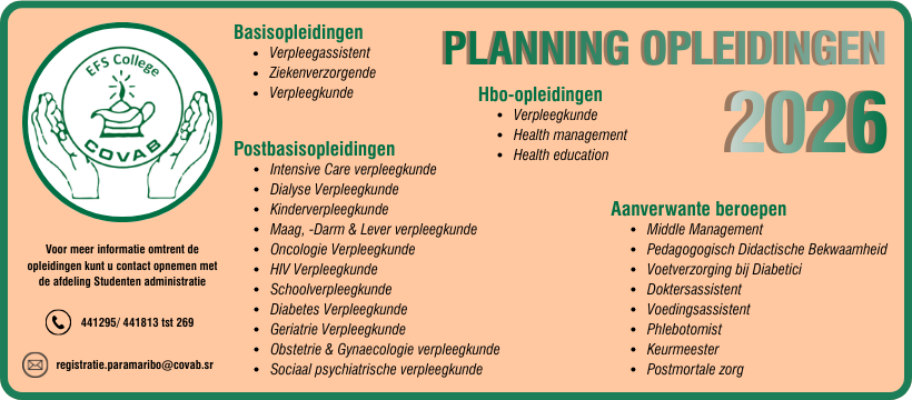 Lees verderDe Centrale Opleiding voor Verpleegkundigen en beoefenaren van Aanverwante Beroepen, thans het Elsje Finck Sanichar College COVAB, is een opleidingsinstituut dat ervoor zorg draagt dat deskundige en zorgzame verpleegkundigen en verzorgenden worden opgeleid.